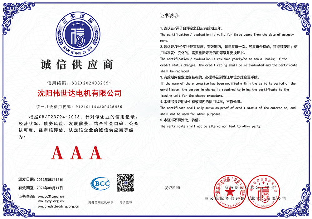 Shenyang Weishida Electric Motor Co., Ltd. traces its origins to the Shenyang Pioneer Electric Motor Factory, established in 1989. As one of the early professional manufacturers dedicated to the research and production of electric motors in China, the company has grown into a large-scale enterprise in Northeast China integrating R&D, production, sales, and maintenance services. Guided by the philosophy of “Technology First, Quality Foremost,” Weishida is committed to innovation-driven development and the mission of energy conservation and consumption reduction. Building on years of meticulously developed core technologies, we persistently explore and pioneer high-efficiency, energy-saving solutions to deliver ideal products. The company holds multiple utility model patents and has obtained various certifications, including quality management system accreditations and energy efficiency labeling filings.